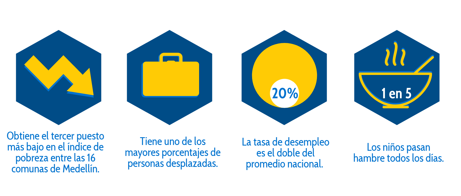 El barrio de María Cano-Carambolas está experimentando el círculo perpetuado de la pobreza, exclusión y violencia, convirtiéndolo en un área de alta problemática social. Por esto es que nosotros educamos, acompañamos, aconsejamos y proveemos asistencia práctica a los vecinos de este barrio, el “más pobre de los pobres”.