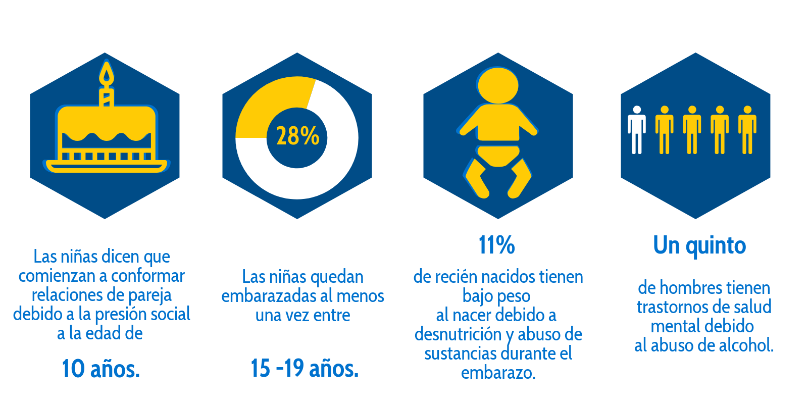 Estos contribuyen a las estrategias de afrontamiento negativas que se ven con frecuencia en nuestra comunidad, como el abuso de sustancias, la perpetuación de la violencia, la sucumbencia a la presión de los compañeros. Estas estrategias negativas, cuando no desafiadas, impactan en la comunidad y contribuyen a altas tasas de violencia doméstica, embarazo adolescente, desnutrición entre los niños, familias disfuncionales y salud comprometida. Casi un tercio de las niñas quedan embarazadas al menos una vez entre los 15 y los 19 años. Por lo tanto, no sorprende que menos de un tercio de los niños del distrito viva con sus padres. Manrique tiene la mayor proporción de bebés con bajo peso al nacer dentro del área metropolitana, y la segunda tasa más alta de mortalidad infantil que apunta a una nutrición insuficiente durante el embarazo y el abuso de sustancias, entre otros factores. Muchas familias no proporcionan a los niños y jóvenes modelos de conducta saludables, un entorno estable y habilidades básicas para la vida.