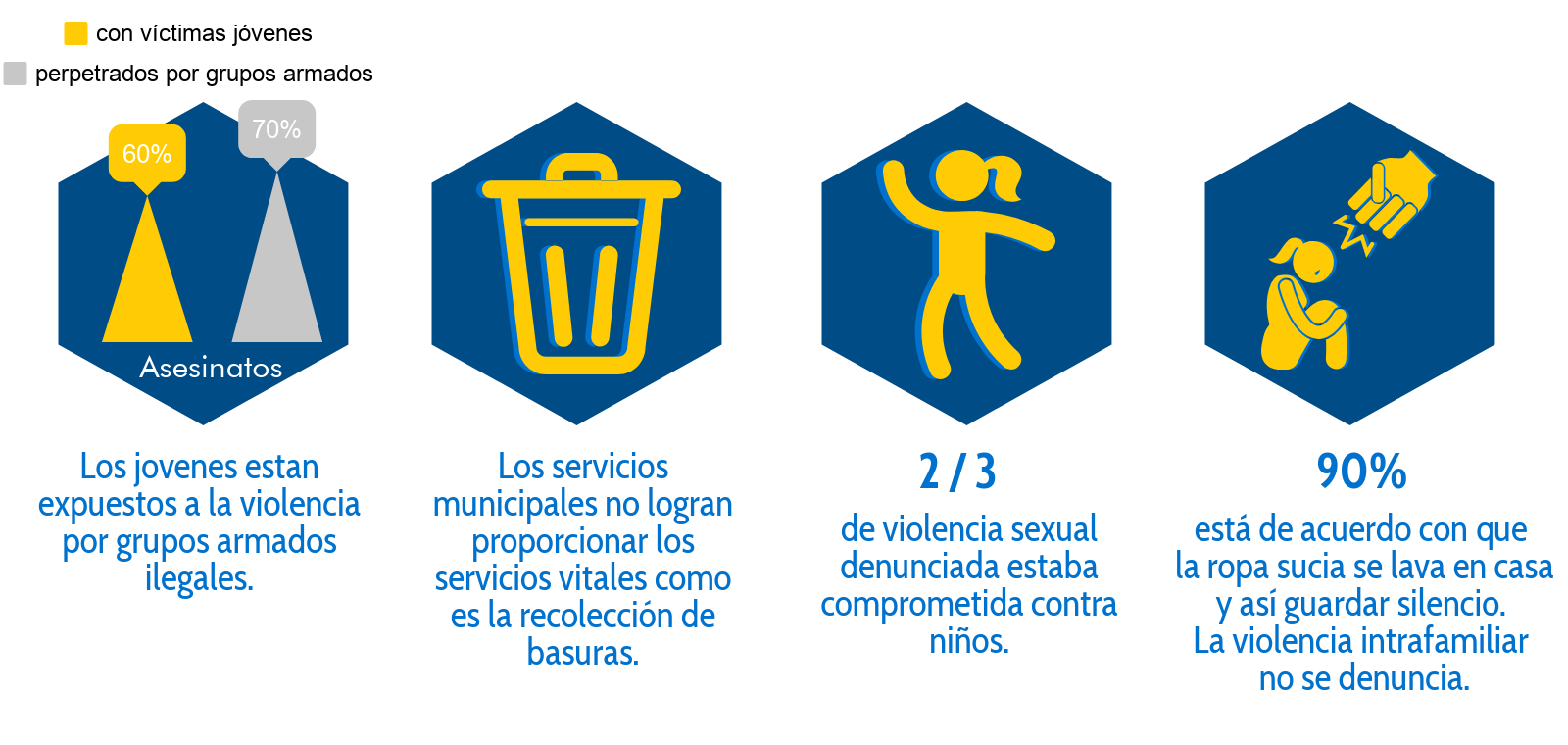 Los residentes del barrio tienen más probabilidades de convertirse en víctimas o en perpetradores de acciones violentas, algo a lo cual ya se han acostumbrado. La violencia intrafamiliar sin ser identificada, no denunciada y perpetuada. Dos tercios de la violencia sexual reportada se comete contra niños y más de la mitad de todas las víctimas de homicidios son jóvenes. Los grupos armados ilegales y las pandillas parecen gobernar el área después de la puesta del sol.